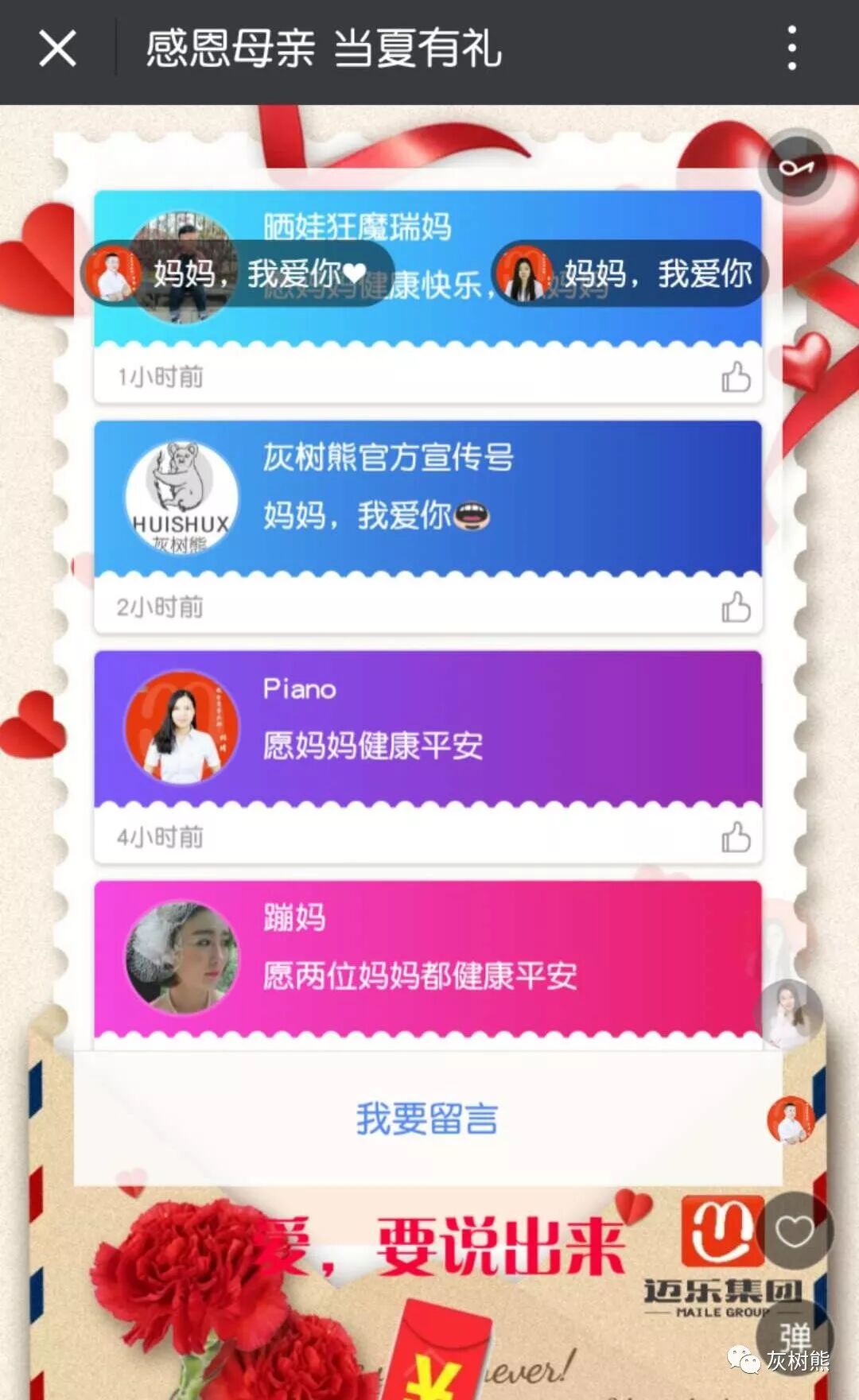 同时,H5上所有留言不停滚动,你的情话会感动其他尚未收到祝福的母亲,你的母亲也会欣喜收到留言版上那么多人的祝福!