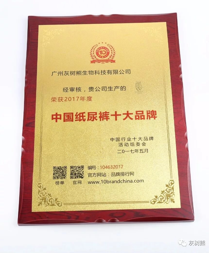2017年5月,《中国品牌日》当天,灰树熊纸尿裤品牌荣获2017年中国十大纸尿裤品牌之一,拥有着美国、瑞士等多国的产品安全检测权威认证。